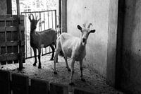 Twee geiten staan in de stal te wachten op hun beurt om gemolken te worden. Verbaasd kijken ze wie er binnenloopt.