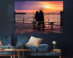 Ik maakte een wandeling langs de kust in mijn geboorteplaats, Taranto, Apulië, Italië, en ik zag deze twee jonge mensen op een bank zitten, knuffelend en kussend. Ik kon al begrijpen dat de zon op het punt stond onder te gaan in een ongelooflijke explosie van kleuren ... geel, paars, oranje, gewoon een lust voor het oog. Ik heb gewoon op het juiste moment gewacht om mijn foto te maken, en ik denk dat het silhoueteffect erg mooi is omdat het naar mijn mening meer het "gevoel" -sensatie geeft aan de toeschouwer