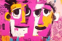 Twee gezichten | Pink Duo - Dit kleurrijke schilderij toont twee vrolijke gezichten met grote ogen en een speelse uitdrukking, tegen een achtergrond van levendig roze, waardoor het een opvallend en modern kunstwerk is.