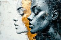 Twee vrouwelijke profielen in een abstracte omgeving. De getextureerde penseelstreken geven de afbeelding een driedimensionale diepte en dynamiek die het oog van de kijker gevangen houdt. Gouden accenten zorgen voor een luxueuze en elegante toets. Dit werk is perfect voor moderne interieurs die op zoek zijn naar een combinatie van hedendaagse esthetiek en diepe symboliek. Het spreekt zowel het oog als de geest aan en nodigt de kijker uit om de diepere betekenis en subtiele details te verkennen. Een ideaal stuk voor kunstliefhebbers die het buitengewone waarderen. De unieke gezichten zijn gemaakt in samenwerking met innovatieve AI.