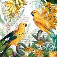 Tropisch aandoend landschap met historische illustraties van twee papegaaien en tropische planten.