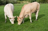 Twee grazende lichte Jersey koeien in een weiland
