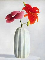 Het digitale kunstwerk toont een witte vaas met twee grote rode bladvormige bloemen. De bloemen hebben een opvallende vorm en de rode kleur is intens en levendig. Het geheel straalt een gevoel van eenvoud en elegantie uit, en nodigt de kijker uit om te genieten van de schoonheid van deze prachtige bloemen.