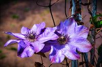 Twee grote purpere clematissen in helder zonlicht tegen wazige achtergrond. Foto van hoge kwaliteit
