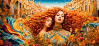 Een uniek portret van twee vrouwen omringd door bloemen, terwijl een charmant stadslandschap op de achtergrond schittert.