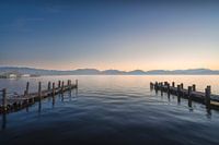 Twee houten pieren of steigers bij zonsopgang in het Massaciuccoli meer.