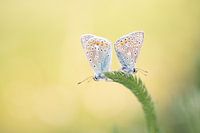 Twee vlinders hangen elegant aan een sierlijke grassoort. Achter de vlinders vervaagt de wereld tot een dromerige gele onscherpte.