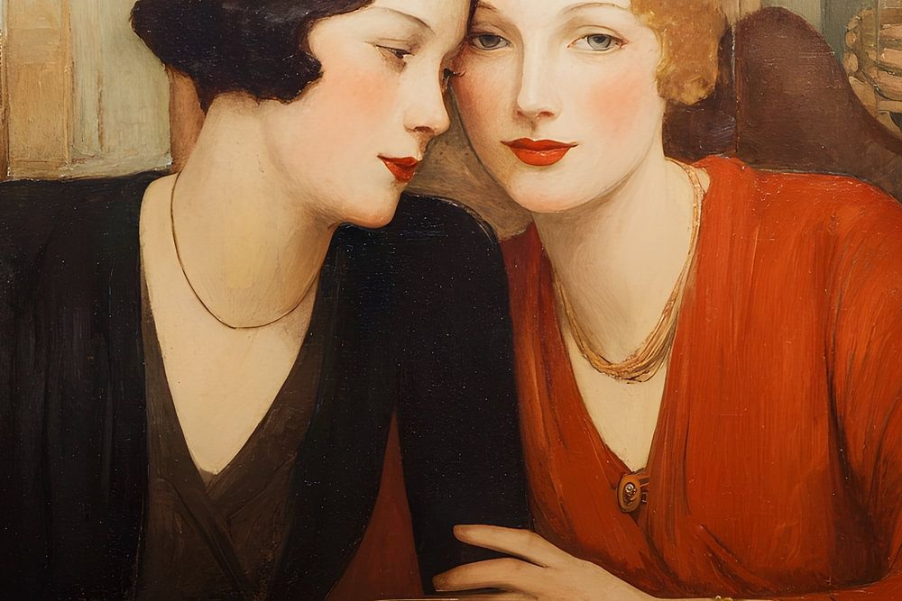 Het schilderij toont twee elegante vrouwen uit de jaren 1920 die dicht bij elkaar zitten in een bekende pose in een bar. De ene vrouw draagt een dieprode jurk, de andere een zwart ensemble - beiden met stijlvolle korte kapsels die doen denken aan de Art Deco esthetiek. Voor hen staan elegante glazen cocktails, met andere gasten en figuren weerspiegeld in de achtergrond, waardoor diepte en sfeer worden gecreëerd. De foto combineert koele elegantie met emotionele nabijheid.