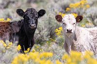 Deze prachtige foto vangt een intiem moment tussen twee jonge kalfjes in een weelderig bloemenveld. De contrasterende kleuren van hun vacht, het levendige geel van de bloemen en het zachte groen van het gras creëren een visueel feest. De kalfjes kijken nieuwsgierig naar de camera, waardoor een gevoel van speelsheid en onschuld ontstaat.…