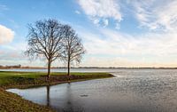 Twee hoge bomen met kale takken aan een landtong in het water. Het is het einde van een zonnige dag in het Nederlandse winterseizoen. De foto is gemaakt in de ondergelopen Noordwaard polder, Nationaal Park De Biesbosch. Het onderlopen van de polder is het gevolge van de hoge waterstand in de aangrenzende rivier de Nieuwe Merwede. In het kader van het grote, ruim vijf jaar durende, project Ruimte voor de Rivier werd de Noordwaardpolder in het jaar 2014 geschikt gemaakt om het overtollige water tijdelijk te op te slaan teneinde overstromingen op ongewenste plaatsen te voorkomen.