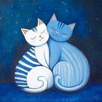 Twee gestileerde katten liggen tegen elkaar aan geknuffeld, omringd door een rustgevende blauwe achtergrond. Hun gezichtsuitdrukkingen zijn tevreden en stralen een gevoel van rust en kameraadschap uit.