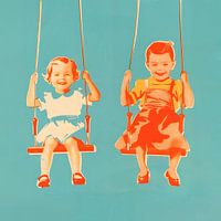 Een poster in retrostijl van twee lachende meisjes op schommels