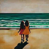 Dit schilderij herinnert ons aan de reizen die we ondernemen, hoe klein ook, en aan de schoonheid om iemand aan onze zijde te hebben als we onze eigen horizon tegemoet treden. Het is minder louter een afbeelding en meer een zachte reflectie, die de kijker fluistert over tijden waarin het leven zo eenvoudig, diepgaand en hoopvol leek als deze twee kleine figuurtjes die op weg zijn naar de zee.