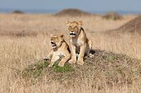 Leeuwenwelp op een termietenheuvel in de Masai Mara in Kenia.