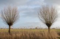 Een typisch Hollands landschap: twee knotwilgen met lange twijgen op een winterse dag. Voor de bomen een rietkraag, erachter weilanden met kaarsrechte sloten. Decfoto isgemaakt in de buurt van Eernewoude in Friesland.
