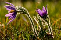 Deze expressieve foto toont twee koebellen (Pulsatilla vulgaris) in het zachte licht van een vroege lentemorgen. De bloem links leunt iets naar voren, alsof ze een geheim fluistert tegen haar buurman. Beide planten staan rechtop in een weiland en zijn gehuld in het eerste zonlicht, dat hun fijne haartjes en structuur benadrukt. Een moment vol stilte en intieme schoonheid.