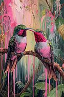 Twee kolibries zittend op een tak. Digitaal kunstwerk, die iedere ruimte van je huis of kantoor kleur geeft.