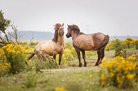 twee konikpaarden staan neus aan neus tussen het gele koolzaad