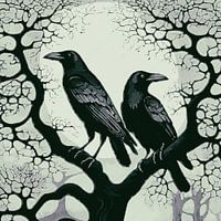 Twee kraaien in een boom in maanlicht in lichtgroen, zwart en zilver is digitaal gemaakt. Medium: illustratie. Format: vierkant.