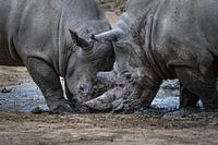 Twee kolossale neushoorn vechten in modder. Pure krachtvertoning. De rechter neushoorn heeft duidelijke verwondingen opgelopen .