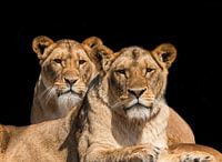 Een portret van 2 leeuwinnen die vanaf een heuveltje omlaag kijken.