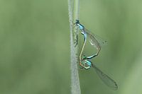 Twee libellen vormen een libellenwiel op een grasspriet. De achtergrond is groen