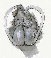 Een aquarel tekening van twee grijze katten die elkaar knuffelen. De linker kat kijkt lief naar de rechter die genietend met zijn ogen dicht een kopje geeft.