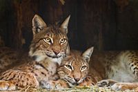 Twee lynxen, waarschijnlijk mannetjes en vrouwtjes, rusten rustig uit; een donkere achtergrond kijkt rustig en zelfverzekerd toe.