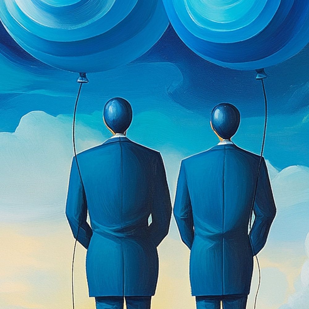 In hun hand houden ze elk een touw vast, waaraan een grote, blauwe spiraalvormige ballon hangt.