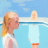 Dit abstracte schilderij toont twee meisjes die zich bevinden aan de rand van een zwembad. Ze staan tegenover elkaar, zonder enige vorm van contact. De spanning tussen hen wordt versterkt door de afstand die ze houden en de uitdrukkingen op hun gezichten. De zomers blauwe lucht en het blauw van het water vullen de leegte tussen hen. Wat…