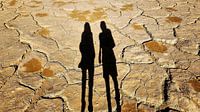 Twee mensen werpen schaduwen op een opgedroogd meer van Frank Heinz