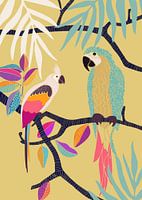 De illustratie toont twee papegaaien, in een warm en levendig kleurenpalet, neergestreken op een uitnodigende tak, tegen de achtergrond van een exotische en uitnodigende sfeer. De algehele sfeer is schattig, levendig en boordevol met de warmte van hun kameraadschap.