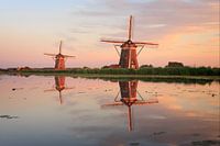 Twee traditionele rietgedekte molens met een perfecte weerspiegeling in het rustige water van de vaart tijdens een zomeravond zonsondergang op het platteland in Leidschendam, Nederland.