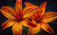 Koop dit bloemen kunstwerk Twee oranje gevlamde lelies met regendruppels van Rietje Bulthuis op canvas, aluminium dibond, (ingelijste) fotoprint, behang en ArtFrame, op maat geprint in Fine-Art kwaliteit.