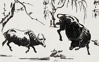 Twee ossen (1679-1748) vintage Japanse houtsnede door Tachibana Morikuni.