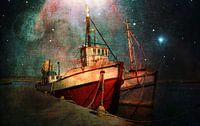 Landschap met twee oude vissersboten in de haven van Velddrif en nachtelijke hemel