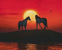 Twee paarden staan op een duin bij de zee. Het is zonsondergang en de lucht kleurt rood. Een paar meeuwen doorkruisen de avondlucht.Dit sfeervolle werk is te koop in verschillende materialen en formaten.