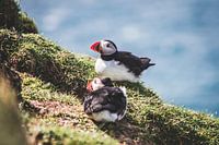 Twee papegaaiduikers, gespot tijdens een wandeling op het eiland Mykines. Het eiland Mykines op de Faeröer Eilanden is een van de beste plekken in Europa om papegaaiduikers (of puffins) te spotten.