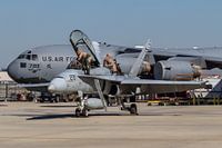 Twee piloten van een F/A-18D Hornet van VMFAT 101 maken zich gereed om te vertrekken vanaf Long Beach Airport, Californië.