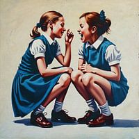 Dit schilderij legt een moment in de tijd vast - een gedeeld geheim tussen twee schoolmeisjes, even onschuldig als diepzinnig. Het ene meisje leunt lichtjes voorover, haar lippen bijna gespleten, alsof ze net iets heeft gezegd dat te mooi is om binnen te houden. Haar vriendin lacht zo hard dat ze bijna omvalt van plezier. De kleuren…