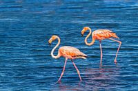 Twee rode caribische flamingo's lopen in water aan kust van Bonaire. Op dit mooie eiland kun je grote groepen zien van deze watervogels. De vogels krijgen hun rode kleur van de zeedieren die ze eten. Hier zijn ze op zoek naar voedsel.