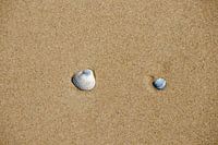 Een minimalistische foto rechtstreeks van boven genomen van twee schelpen op het strand