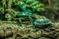 Twee schildpadden zittend op een rots