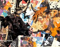Stoer en modern kunstwerk van twee schots hooglander koeien. Ze hebben de koppen bij elkaar. Een grafisch en stilistisch kunstwerk met kenmerken van street art en pop art.