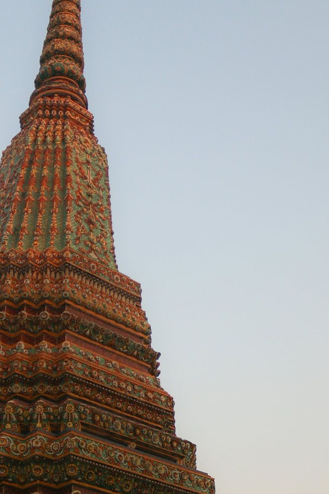 Twee boeddhistische stoepa's reiken symmetrisch naar de heldere hemel in laag gezichtspunt. Deze pagodes maken deel uit van Phra Chedi Rai in het Wat Pho Boeddha-tempelcomplex. 1