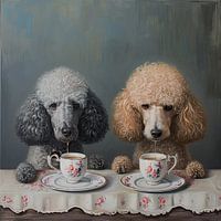 Grappig en schattig portret van twee poedels die naast elkaar genieten van een kopje thee.