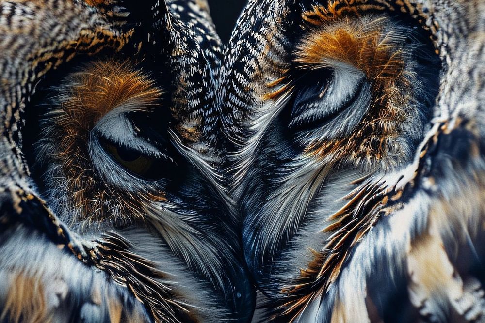 Deze prachtige foto toont twee uilen in een intieme close-up. Hun veren zijn gedetailleerd en dynamisch weergegeven, waardoor de schoonheid en complexiteit van deze majestueuze vogels prachtig tot uiting komen. De donkere achtergrond zorgt ervoor dat de uilen nog meer opvallen en creëert een dramatisch contrast. Dit kunstwerk is perfect voor natuurliefhebbers en voegt een vleugje wilde elegantie toe aan elke ruimte. Het zou prachtig staan in een kantoor of slaapkamer, waar het kan dienen als een constante bron van inspiratie en rust. Laat je betoveren door de intense blikken en gedetailleerde veren van deze prachtige uilen.