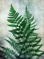 Twee groene varenranken strekken zich uit en overlappen elkaar diagonaal over een lichte, blauwgrijze, gestructureerde achtergrond. De fijne details van de varenbladeren worden benadrukt tegen de sfeervolle, hemelachtige achtergrond.