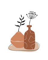 Abstracte minimalistische illustratie van twee vazen met planten erin. De achtergrond is wit.