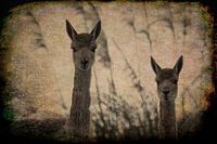 Twee vicuna's in de natuur. De foto is digitaal bewerkt met een retro effect. Hierdoor krijgt de foto een sfeervoller look.